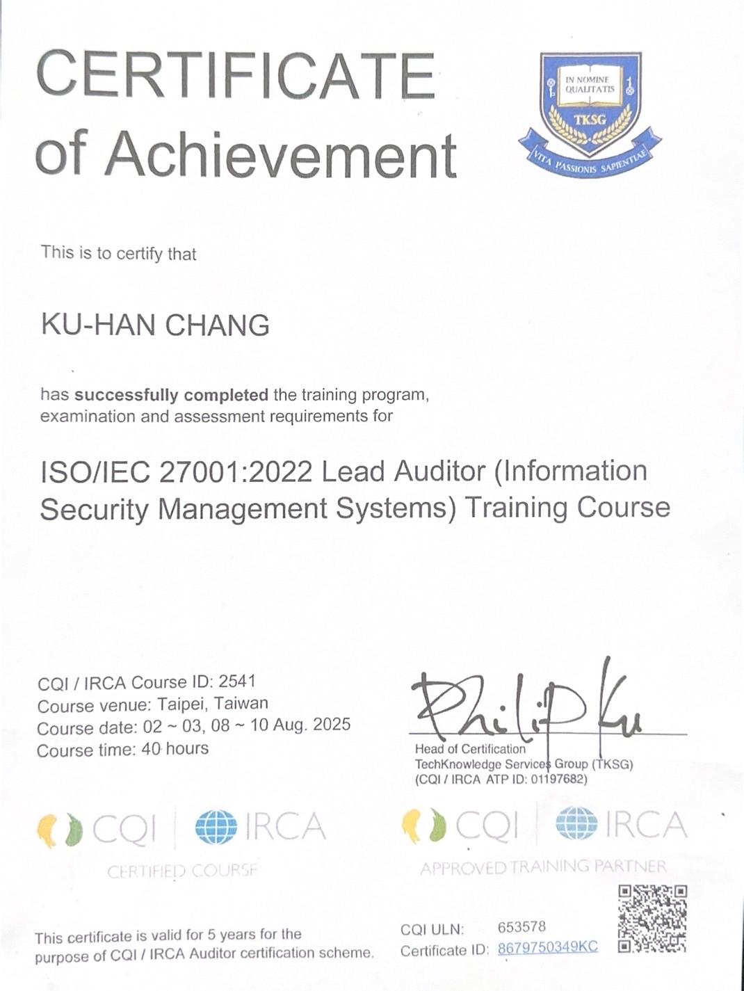 賀!!!本公司張顧瀚先生順利取得 ISO 27001:2022Lead Auditor(資訊安全管理系統主導稽核員)證照